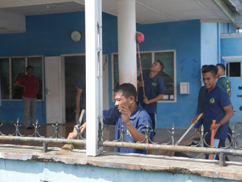 Kegiatan ini melibatkan jajaran petugas, warga binaan pemasyarakatan, serta peserta magang Rutan Pangkalan Brandan yang bekerja sama membersihkan area dalam mushola, kamar mandi, hingga halaman sekitar.